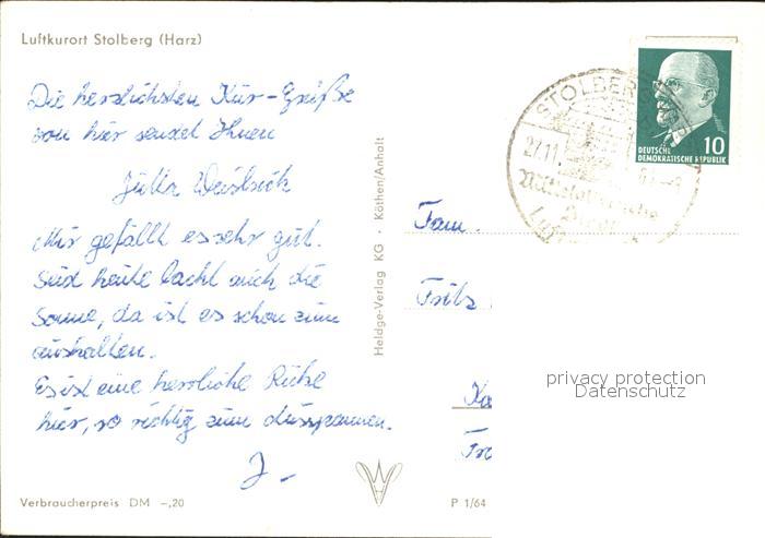 72328482 alte Postkarte Stolberg Harz Stadtansicht postalisch gelaufen Erhaltung siehe scans KatCode: 11110015087410