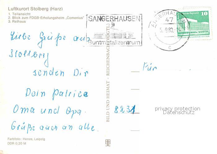 72629468 alte Postkarte Stolberg Harz Teilansicht FDGB Erholungsheim Comenius Rathaus postalisch gelaufen Erhaltung siehe scans [WerneD78] KatCode: 11110015087410