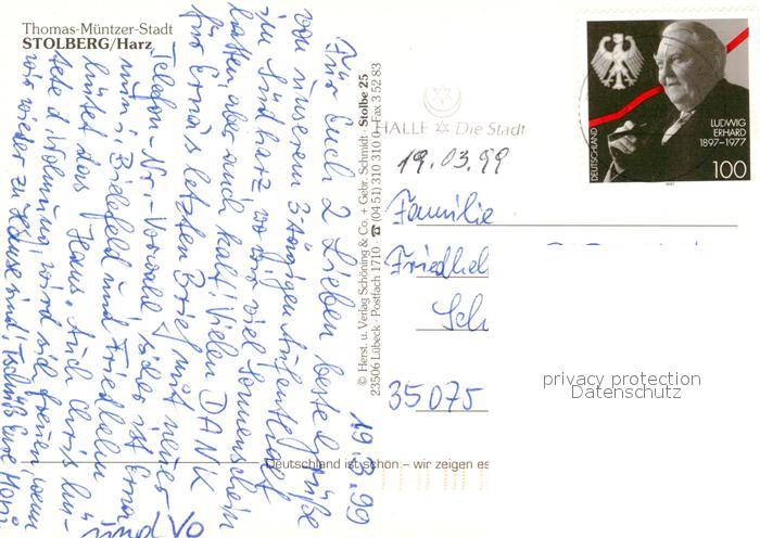 73253819 alte Postkarte Stolberg Harz Thomas Muentzer Stadt Stadttor Schloss Fachwerkhaeuser postalisch gelaufen Erhaltung siehe scans [KathaD81] KatCode: 11110015087410