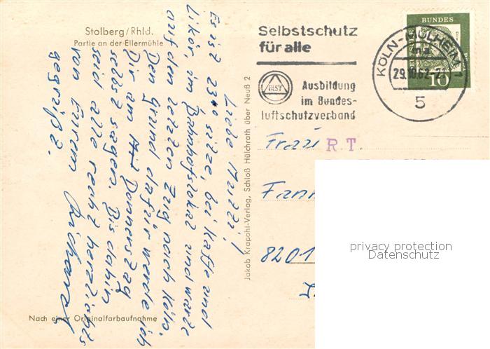 73801199 alte Postkarte Stolberg Rheinland Partie an der Ellermuehle postalisch gelaufen Erhaltung siehe scans [WerneD78] KatCode: 11110005354032
