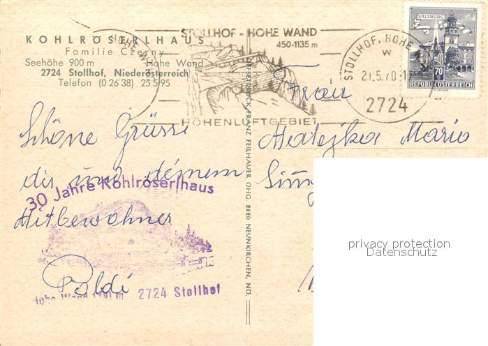 73042477 alte Postkarte Stollhof Hohe Wand Kohlroeserlhaus Gaststaette Restaurant Terrasse postalisch gelaufen Erhaltung siehe scans [FriedD77] KatCode: 11390