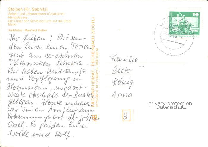 72378317 alte Postkarte Stolpen Seiger und Johannisturm Klengelsburg Stadtblick Schloesserturm Markt postalisch gelaufen Erhaltung siehe scans KatCode: 11110014287390