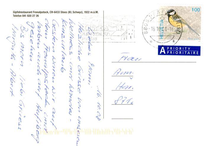 13921149 alte Postkarte Stoos SZ Gipfelrestaurant Fronalpstock Fliegeraufnahmen postalisch gelaufen Erhaltung siehe scans [FriedD77] KatCode: 11470170500504