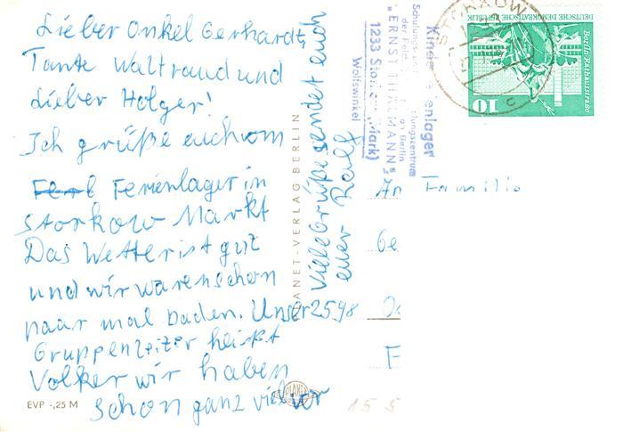 73896750 alte Postkarte Storkow Mark Rudolf Breitscheid Strasse Storkower Kanal Burghof Strandbad postalisch gelaufen Erhaltung siehe scans [WerneD78] KatCode: 11110012067481