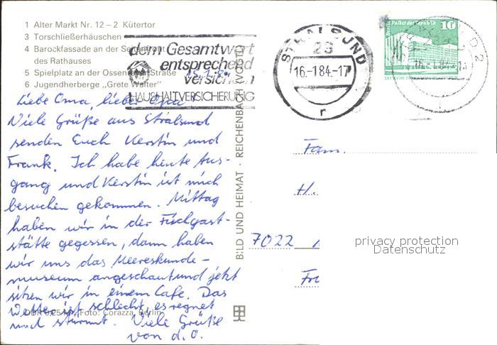 72311477 alte Postkarte Stralsund Mecklenburg Vorpommern Alter Markt Torschliesserhaeuschen Jugendherberge Grete Walter postalisch gelaufen Erhaltung siehe scans KatCode: 11110013005000