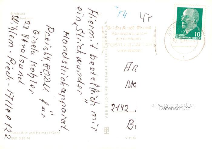 73093097 alte Postkarte Stralsund Mecklenburg Vorpommern Denkmal postalisch gelaufen Erhaltung siehe scans [LiesaD40] KatCode: 11110013005000