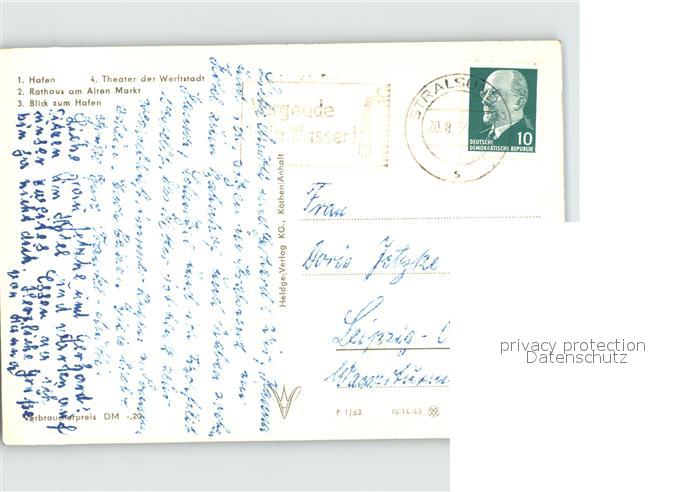 72390020 alte Postkarte Stralsund Mecklenburg Vorpommern Hafen Rathaus Markt postalisch gelaufen Erhaltung siehe scans KatCode: 11110013005000