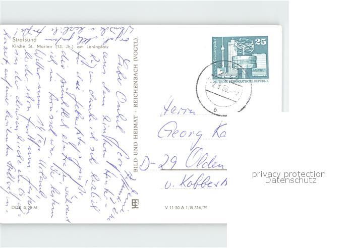 72078849 alte Postkarte Stralsund Mecklenburg Vorpommern Kirche St Marien am Leninplatz postalisch gelaufen Erhaltung siehe scans KatCode: 11110013005000