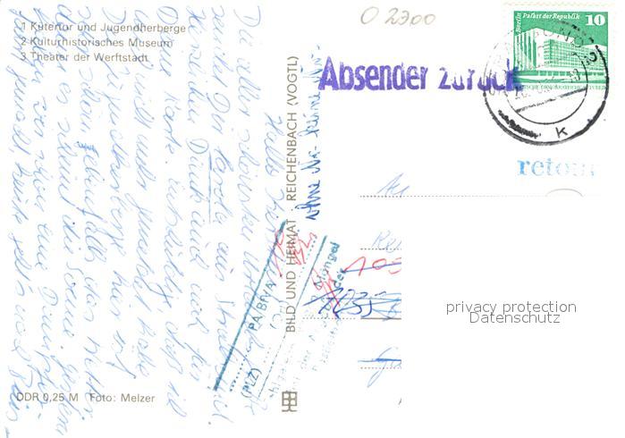 72941232 alte Postkarte Stralsund Mecklenburg Vorpommern Kuetertor Jugendherberge Museum Theater postalisch gelaufen Erhaltung siehe scans [NatalD47] KatCode: 11110013005000