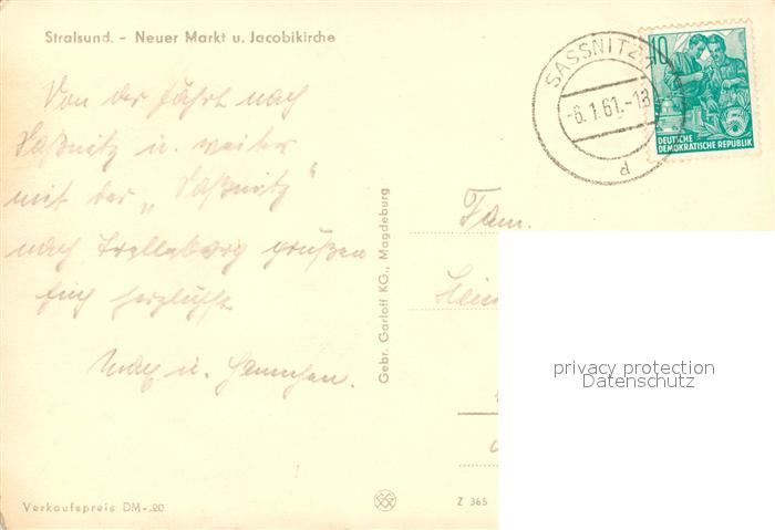 33597881 alte Postkarte Stralsund Mecklenburg Vorpommern Neuer Markt und Jacobikirche postalisch gelaufen Erhaltung siehe scans [WerneD78] KatCode: 11110013005000