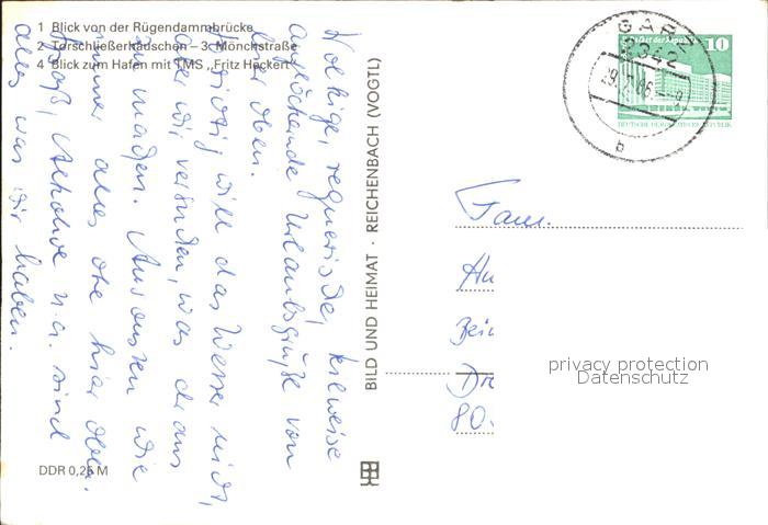 72357307 alte Postkarte Stralsund Mecklenburg Vorpommern Ruegendammbruecke Torschliesserhaeuschen MS Fritz Heckert postalisch gelaufen Erhaltung siehe scans KatCode: 11110013005000