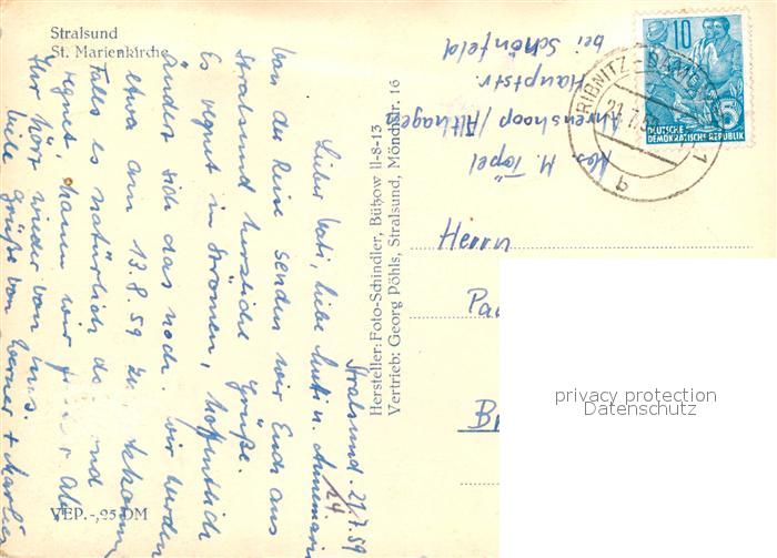 72925710 alte Postkarte Stralsund Mecklenburg Vorpommern St. Marienkirche postalisch gelaufen Erhaltung siehe scans [PaolaD17] KatCode: 11110013005000