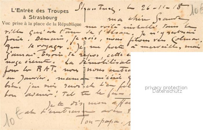 13108541 Strasbourg Alsace Entrée des Troupes a Strasbourg Place de la République postalisch nicht gelaufen Erhaltung siehe scans [FriedD77] KatCode: 11170067867482