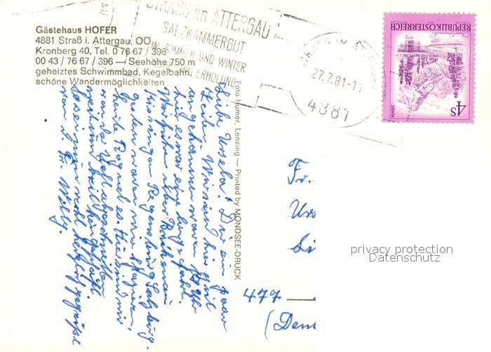 73244878 alte Postkarte Strass Attergau Gaestehaus Hofer postalisch gelaufen Erhaltung siehe scans [KathaD81] KatCode: 11390315041741