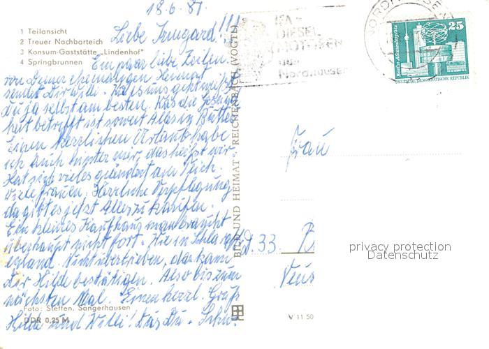 73544260 alte Postkarte Strassberg Harzgerode Teilansicht Treuer Nachbarteich Konsum Gaststaette Lindenhof Springbrunnen postalisch gelaufen Erhaltung siehe scans [FriedD77] KatCode: 11110015085145