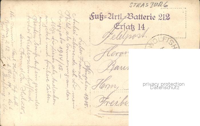 12300847 Strassburg Elsass Fussartillerie Batterie 212 ersatz 14 wolfisheim WK 1 Militaria KatCode 11170067867482