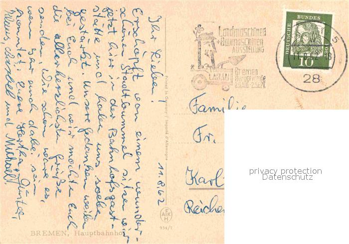 alte Postkarte Strassenbahn Bremen Hauptbahnhof postalisch gelaufen Erhaltung siehe scans [PaolaD17]