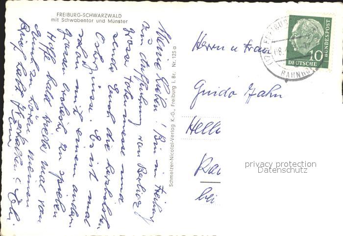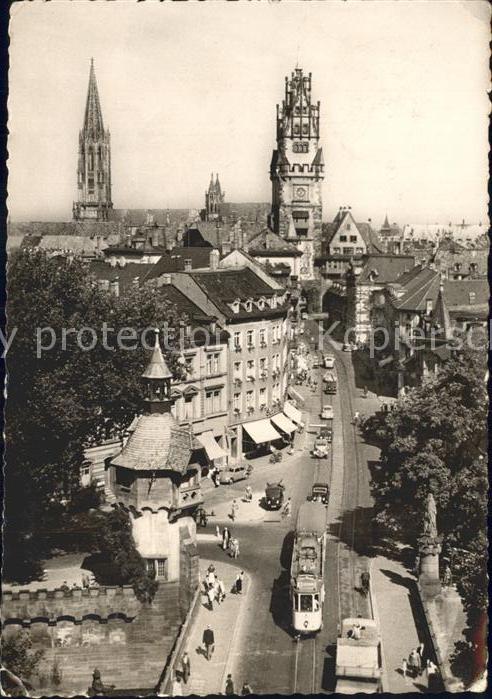 alte Postkarte Strassenbahn Freiburg im Breisgau Schwabentor Muenster postalisch gelaufen Erhaltung siehe scans