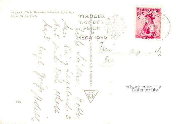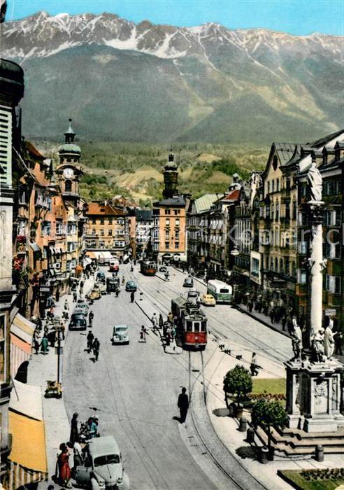 alte Postkarte Strassenbahn Innsbruck Maria Theresienstrasse Annasaeule postalisch gelaufen Erhaltung siehe scans [PaolaD17]