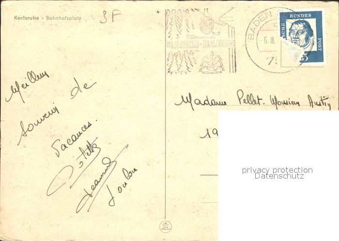 alte Postkarte Strassenbahn Karlsruhe Bahnhofsplatz postalisch gelaufen Erhaltung siehe scans