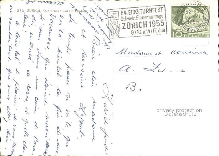 alte Postkarte Strassenbahn Quaibruecke Buerkliplatz Zuerich Stempel 64. EIDG. Turnfest postalisch gelaufen