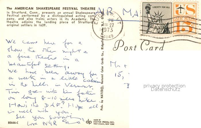 73131333 old postcard Stratford Connecticut American Shakespeare Festival Theatre postalisch gelaufen Erhaltung siehe scans [NatalD47] KatCode: 14140070000000