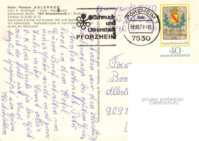 73644364 alte Postkarte Straubenhardt Hotel Pension Cafe Adlerhof Schwanner Warte postalisch gelaufen Erhaltung siehe scans [FriedD77] KatCode: 11110008236072