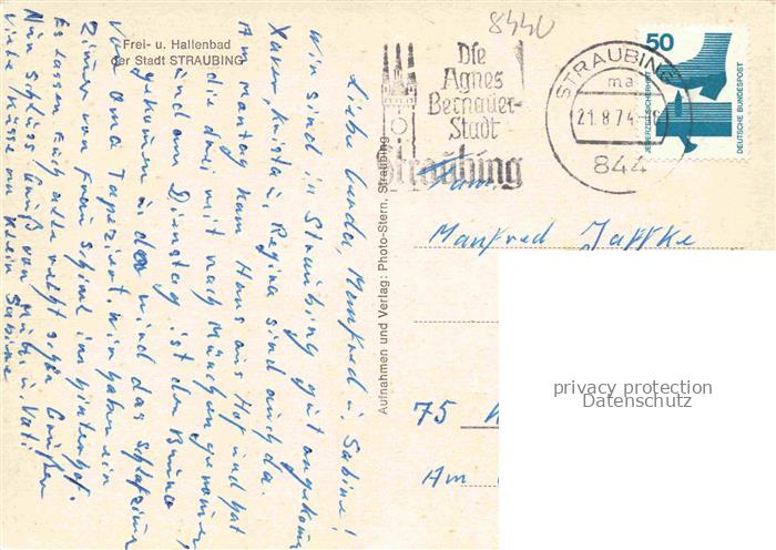 74049254 alte Postkarte Straubing Freibad Sprungturm Rutschbahn Hallenbad postalisch gelaufen Erhaltung siehe scans [FriedD77] KatCode: 11110009263000