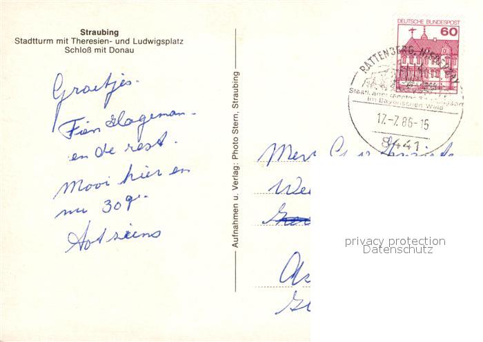 72932304 alte Postkarte Straubing Stadtturm Theresien und Ludwigsplatz Schloss Donau postalisch gelaufen Erhaltung siehe scans [WerneD78] KatCode: 11110009263000