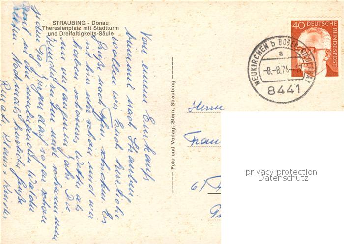 73266918 alte Postkarte Straubing Theresienplatz Stadtturm Dreifaltigkeitssaeule postalisch gelaufen Erhaltung siehe scans [FriedD77] KatCode: 11110009263000