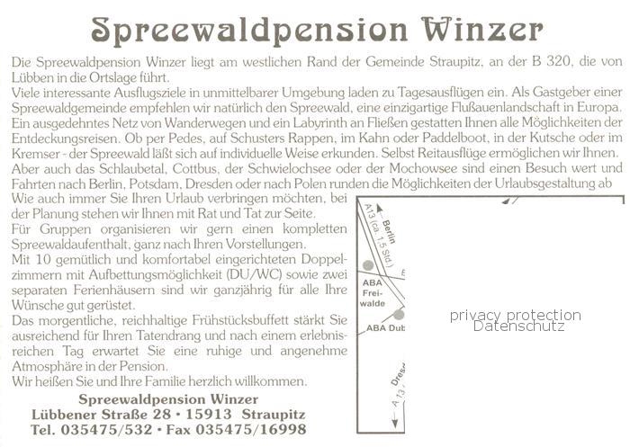 73797100 Straupitz Spreewaldpension Winzer postalisch nicht gelaufen Werbekarte (keine Postkarte) Erhaltung siehe scans [WerneD78] KatCode: 11110012061476
