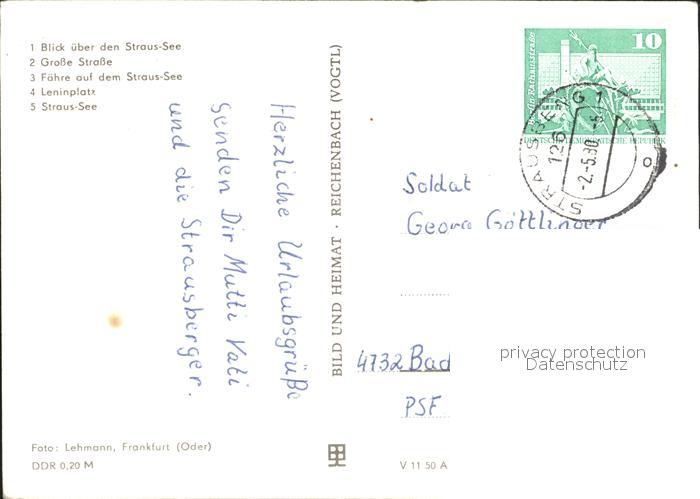 72328757 alte Postkarte Strausberg Brandenburg Straussee Grosse Strasse Faehre Leninplatz Denkmal Statue Schwaene postalisch gelaufen Erhaltung siehe scans KatCode: 11110012064472
