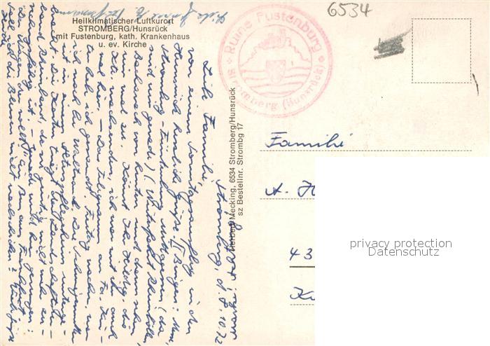 73691428 alte Postkarte Stromberg Hunsrueck Panorama Luftkurort mit Fustenburg Krankenhaus Kirche postalisch gelaufen Erhaltung siehe scans [FriedD77] KatCode: 11110007133103