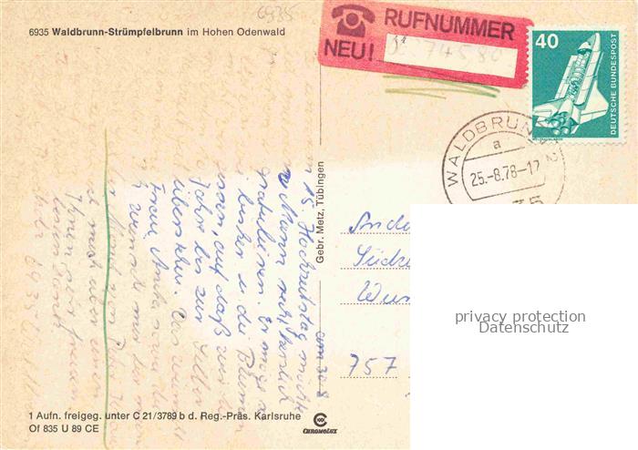 74047724 alte Postkarte Struempfelbrunn Waldbrunn Schloss Zwingenberg Fliegeraufnahme Katzenbuckelturm Hoellgrund Kurzentrum Muelben postalisch gelaufen Erhaltung siehe scans [WerneD78] KatCode: 11110008225118