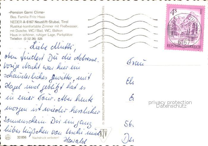 11931816 alte Postkarte Stubaital Pension Garni Clima postalisch gelaufen Erhaltung siehe scans KatCode: 11390332070334