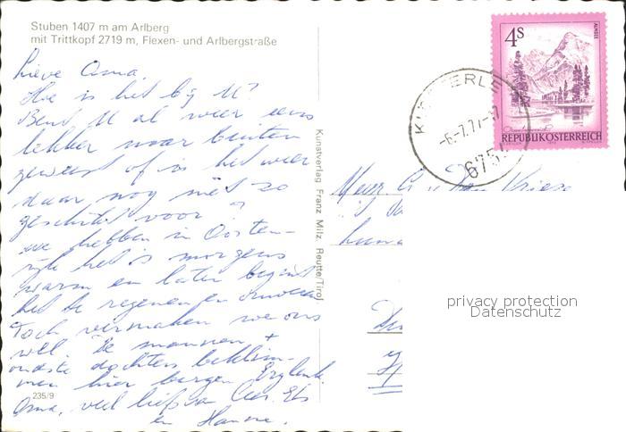 72093888 alte Postkarte Stuben Vorarlberg mit Trittkopf Flexen und Arlbergstr postalisch gelaufen Erhaltung siehe scans KatCode: 11390341080112