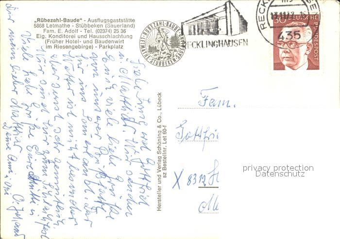 72052972 alte Postkarte Stuebbeken Ruebezahl Baude Ausflugsgaststaette postalisch gelaufen Erhaltung siehe scans KatCode: 11110005962024