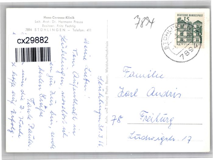 30923872 alte Postkarte Stuehlingen ans Carossa Klinik postalisch gelaufen KatCode: 11110008337106
