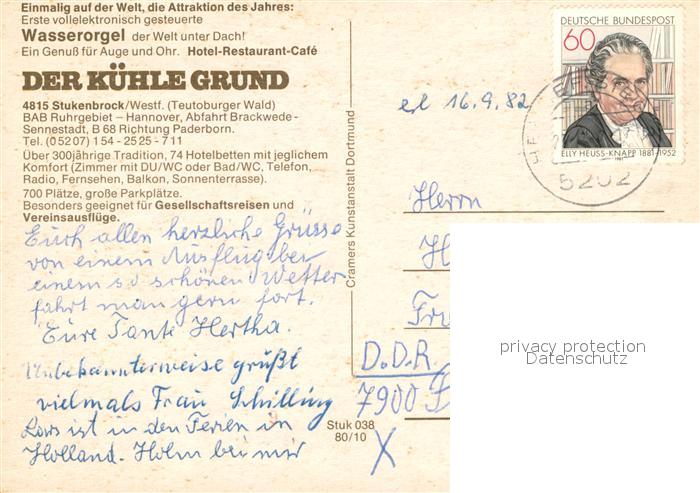 73660353 alte Postkarte Stukenbrock Hotel Restaurant Der kuehle Grund Wasserorgel postalisch gelaufen Erhaltung siehe scans [FriedD77] KatCode: 11110005754036