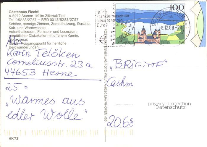 72073345 alte Postkarte Stumm Zillertal Gaestehaus Flechtl postalisch gelaufen Erhaltung siehe scans KatCode: 11390335070931