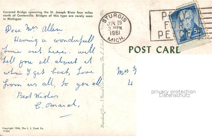73061564 old postcard Sturgis Michigan Covered Bridge spanning the St Joseph River postalisch gelaufen Erhaltung siehe scans [WerneD78] KatCode: 14140240000000