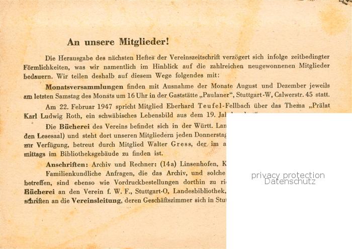 73804374 STUTTGART CITY Einladung zur Mitgliederversammlung des Vereins fuer Wuerttembergische Familienurkunde postalisch gelaufen Erhaltung siehe scans [WerneD78] alte Postkarte Wern Katcode 11110008111000