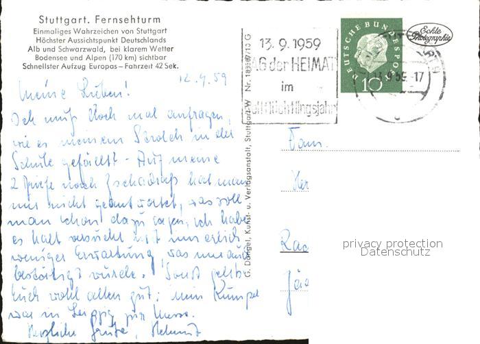 72412951 alte Postkarte STUTTGART CITY Fernsehturm postalisch gelaufen Erhaltung siehe scans KatCode: 11110008111000