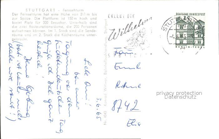 72518547 alte Postkarte STUTTGART CITY Fernsehturm postalisch gelaufen Erhaltung siehe scans KatCode: 11110008111000