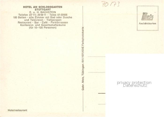 73867089 STUTTGART CITY Hotel am Schlossgarten Restaurant postalisch nicht gelaufen Erhaltung siehe scans [FriedD77] Frie Katcode 11110008111000