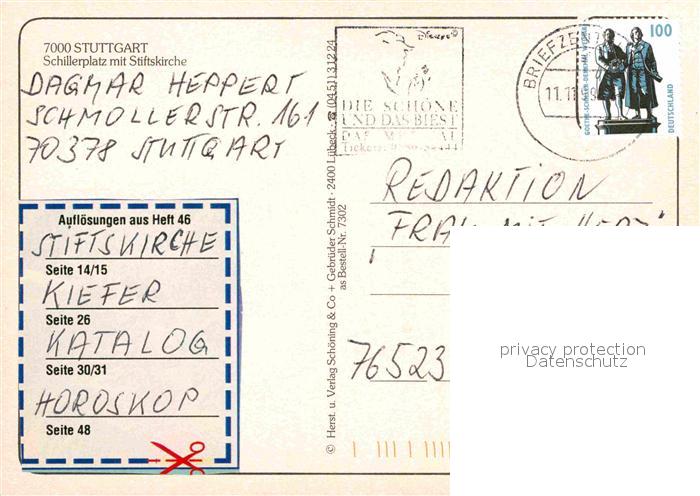 72724278 alte Postkarte STUTTGART CITY Schillerplatz mit Stiftskirche Denkmal Statue postalisch gelaufen Erhaltung siehe scans [FriedD77] KatCode: 11110008111000