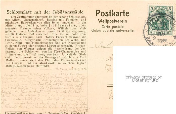 73846495 STUTTGART CITY Schlossplatz mit der Jubilaeumssaeule postalisch gelaufen Erhaltung siehe scans [FriedD77] alte Postkarte Frie Katcode 11110008111000