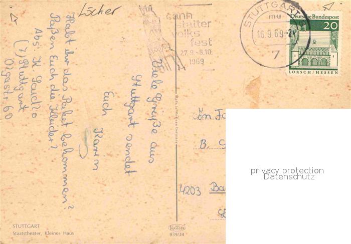72860846 alte Postkarte STUTTGART CITY Staatstheater Kleines Haus postalisch gelaufen Erhaltung siehe scans [LiesaD40] KatCode: 11110008111000