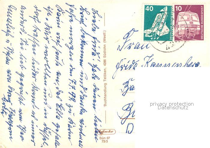 73673237 alte Postkarte Suedlohn Schulen Alte Muehle Kirche Haus Loen Hospital Ehrenmal Haus der Vereine postalisch gelaufen Erhaltung siehe scans [FriedD77] KatCode: 11110005554060