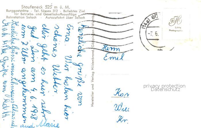 73832450 alte Postkarte Suessen Goeppingen Burgruine Staufeneck Berggaststaette postalisch gelaufen Fliegeraufnahme Erhaltung siehe scans [FriedD77] KatCode: 11110008117049
